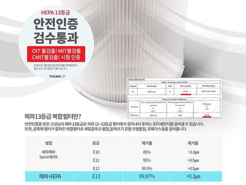 씽크에어 AD12C 공기청정기는 헤파 13등급 복합필터를 사용합니다.
