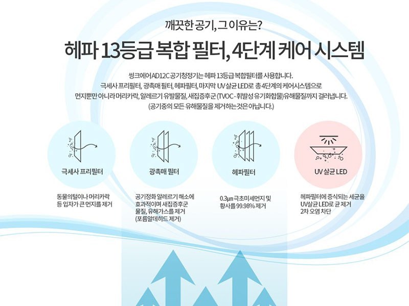 극세사 프리필터, 광촉매 필터, 헤파필터, 마지막 UV살균 LED로 총 4단계의 케어시스템으로 먼지뿐만 아니라 머리카락, 알레르기 유발물질, 새집증후군(TVOC-휘발성 유기화합물) 유해물질까지 걸러냅니다.