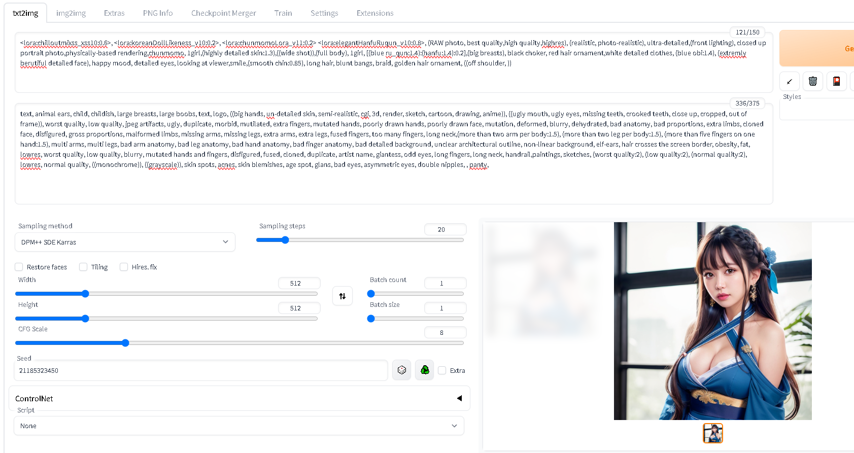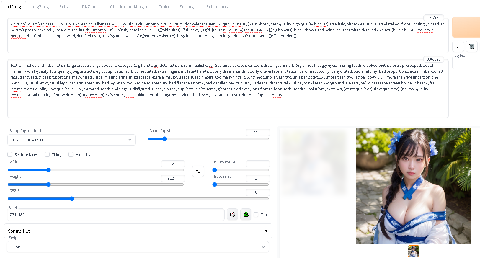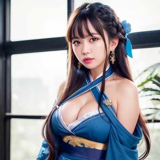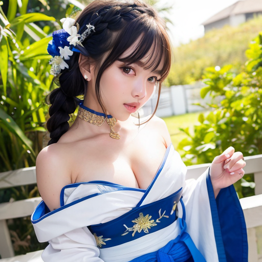 <lora:chilloutmixss_xss10:0.6>,<lora:koreanDollLikeness_v10:0.2>,<lora:chunmomoLora_v11:0.2><lora:elegantHanfuRuqun_v10:0.8>,(RAWphoto,bestquality,highquality,highres),(realistic,photo-realistic),ultra-detailed,(frontlighting),closedupportraitphoto,physically-basedrendering,chunmomo,1girl,(highlydetailedskin:1.3),((wideshot)),(fullbody),1girl,[(blueru_qun:1.4):(hanfu:1.4):0.2],(bigbreasts),blackchoker,redhairornament,whitedetailedclothes,(blueobi:1.4),(extremlyberutifuldetailedface),happymood,detailedeyes,lookingatviewer,smile,(smoothchin:0.85),longhair,bluntbangs,braid,goldenhairornament,((offshoulder,))