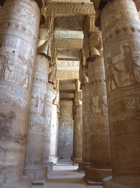 덴데라에는 3개의 신전이 있었다고 한다. 그러나 현재는 하토르 신전 하나만 남아있다. 하토르신전은 고대 이집트 최후의 종교적 건축물이다. 이 시대 이후로는 로마의 점령 시기로 넘어갔다. 하토르 신전에 들어가면 제일 먼저 눈길을 잡는 것이 하토르 신의 얼굴이다. 6개의 기둥 중간에 있는것이 하토루 신의 얼굴이다. 이런 얼굴이 신전안의 모든 기둥에 조각 되어 있다. 또 안으로 들어가면 클레오파트라의 모습을 그린 부조가 있다. 신전의 구석구석을 둘러보면 특이한건 하토루 신전의 거의 모든 부조는 천정이든 벽면이든 채색이 되어있다.