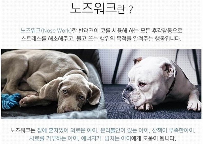 노즈워크(Nose Work)란? 반려견이 코를 사용해 하는 모든 후각활동으로 스트레스를 해소해주고,