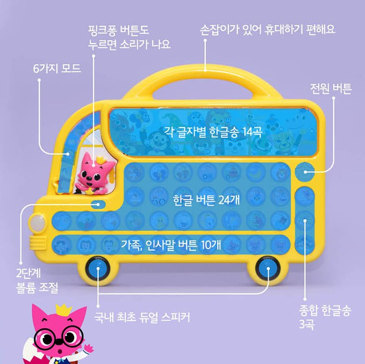 6가지 다양한 모드와 입체버튼, 불빛 노래와 소리로 아이와 엄마의 마음을 사로잡은 『핑크퐁 한글버스』