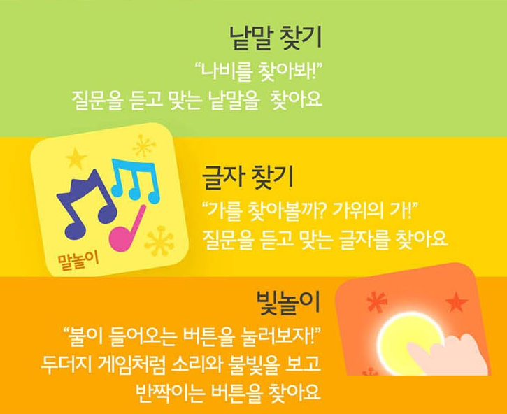 3) 글자 찾기: “가를 찾아볼까? 가위의 가!” 질문을 듣고 맞는 글자모듯 ㅓ를 찾아요4) 낱말 찾기: “가위를 찾아봐!” 질문을 듣고 맞는 낱말을 찾아요.