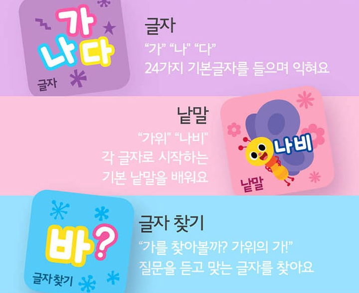 1) 글자 : “가” “나” 24가지 기본글자를 들으며 익혀요.