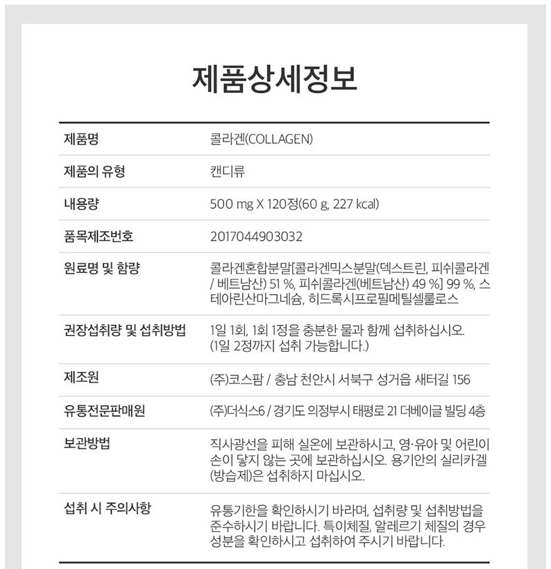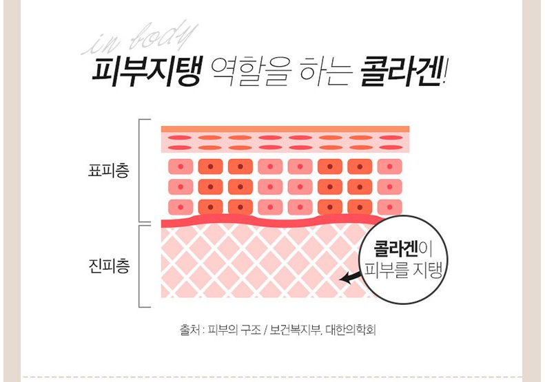 - 피부의 형태를 유지하고 피부 조직을 단단하게 만드는 역할로 피부, 뼈, 관절, 머리카락 등 꼭 필요한 주요 단백질입니다.