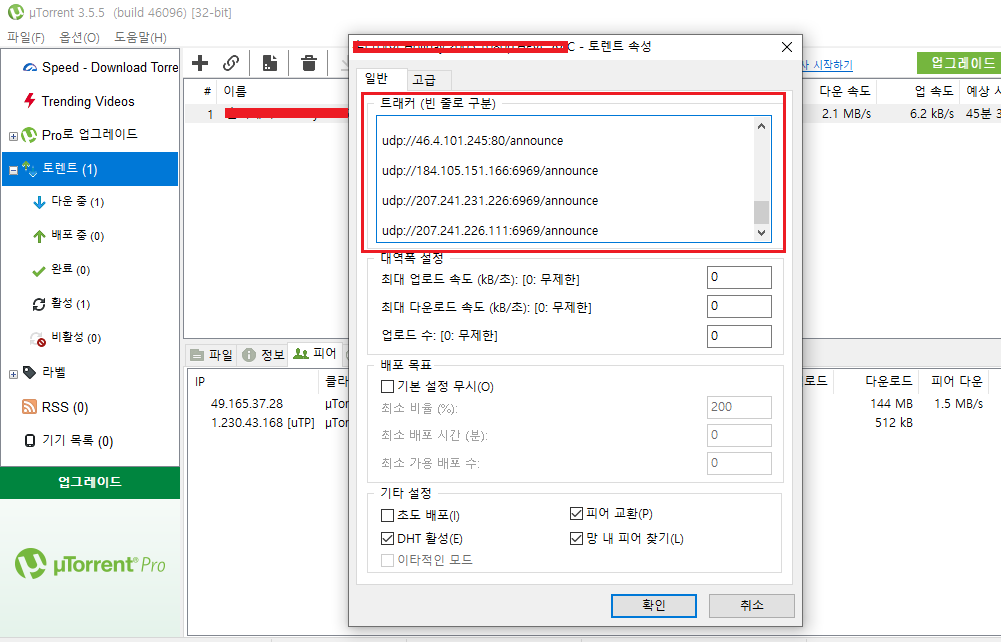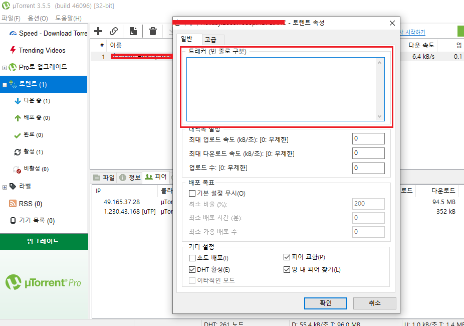 기본적인 트래커가 있습니다. 빨간 박스 부분이 트래커 목록을 넣는 부분입니다. 각 트래커 주소는 빈줄로 구분합니다.