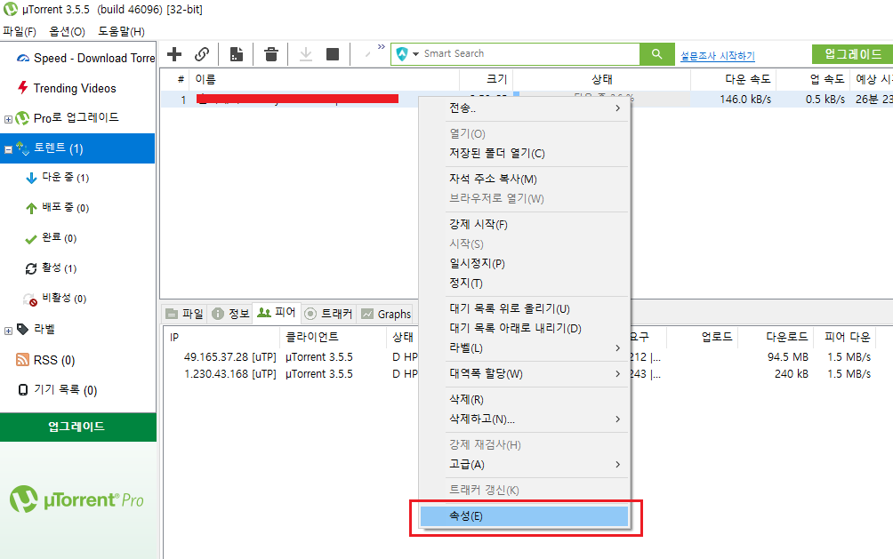 우선 파일하나를 다운로드 하고 있어야 합니다. 그럼 위와 같이 목록에 파일이름이 있죠? 이곳에서 우클릭을 해주면 맨 아래에 속성이 보입니다. 속성을 눌러주세요.