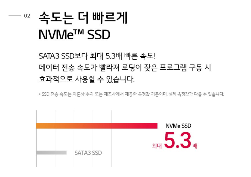 256GB의 SSD를 장착하여 기존 SATA3의 SSD보다 5.3배나 빠른 성능의 NVMe SSD 장착!!