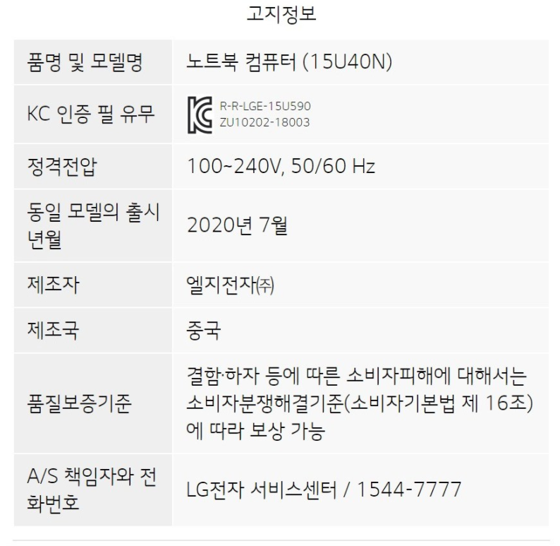 | 품명 및 모델명 | LG전자 2020 울트라 PC 15U40N-GA76K | KC 인증 필 유무 | ZU10202-18003/ R-R-LGE-15U590 |