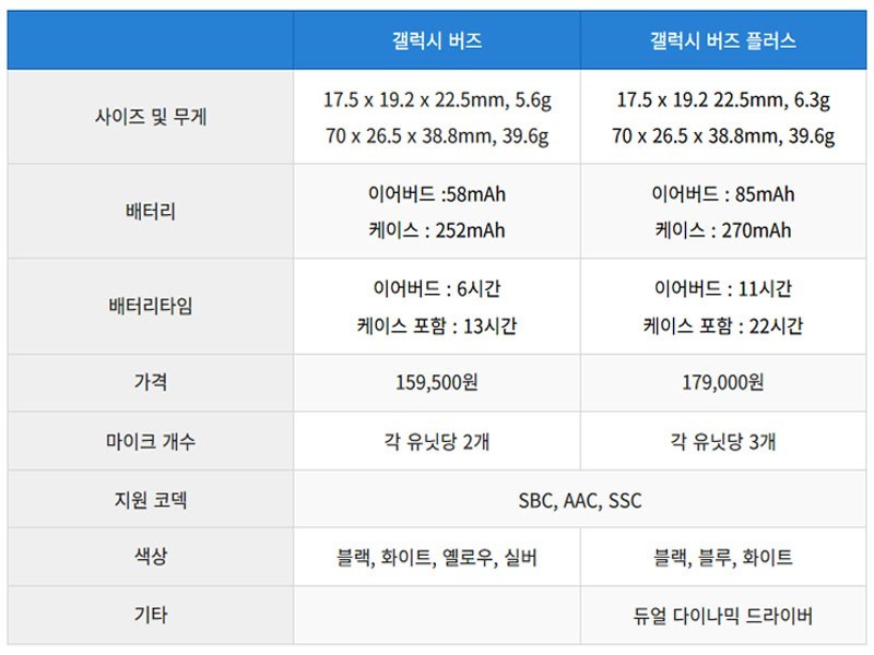 우선 갤럭시버즈 와 갤럭시버즈플러스 비교 스펙!!