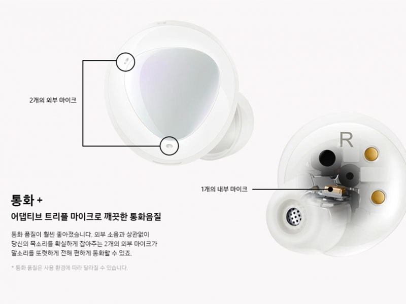 이어버드를 착용한 채 통화를 하면 주변 소음이 많이 섞여 제대로 된 통화가 힘들다고 많은 후기들을 볼수 있습니다. 이 부분을 개선하기 위해 삼성은 이어버드안에 마이크를 하나 더 추가하여 총 세 개의 마이크를 탑재하여 출시하였습니다.